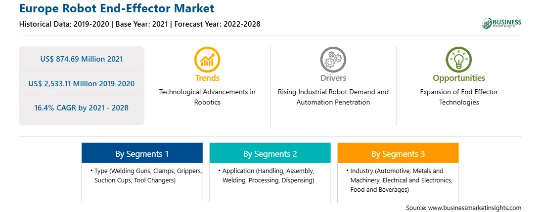 の 2028年までのアジア太平洋地域のロボットエンドエフェクター 市場 価値がある US$ 874.69 Million で 2021, 到達するように投影する US$ 2,533.11 Million による 2028.