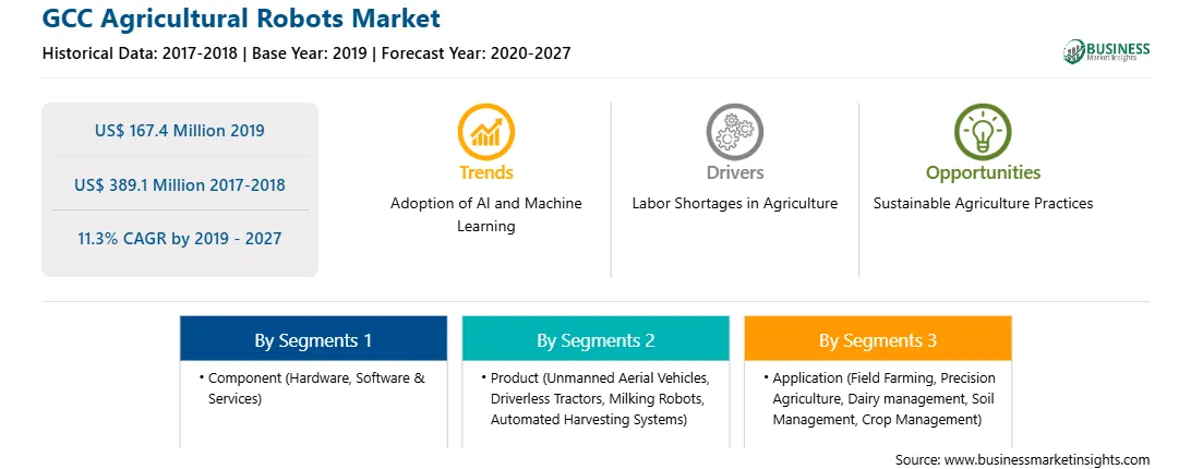 の 2027 年までの GCC 農業ロボット 市場 価値がある US$ 167.4 Million で 2019, 到達するように投影する US$ 389.1 Million による 2027.