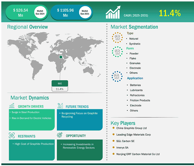GCC グラファイト市場は 2024 年に 5 億 2,654 万米ドルと評価され、2031 年までに 1 億 1,0596 万米ドルに達すると予測されています。